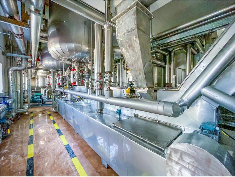 (3)風(fēng)機(jī)冷凝工序:本工序采用高壓風(fēng)機(jī)機(jī)組,該設(shè)備抽汽量大,運(yùn)行平穩(wěn)。高壓風(fēng)機(jī)機(jī)組配套列管式換熱器,原料中蒸發(fā)的水蒸汽分子混合油煙異味分子揮發(fā)物在常壓狀態(tài)下快速從原料油脂中分離,隨風(fēng)機(jī)管道氣流進(jìn)入列管換熱器,換熱器采用冷水逆流循環(huán)降溫,在冷凝作用下將蒸汽油煙揮發(fā)物汽一液轉(zhuǎn)化,形成蒸餾水收集到分液罐內(nèi),控制廢氣自由排放。